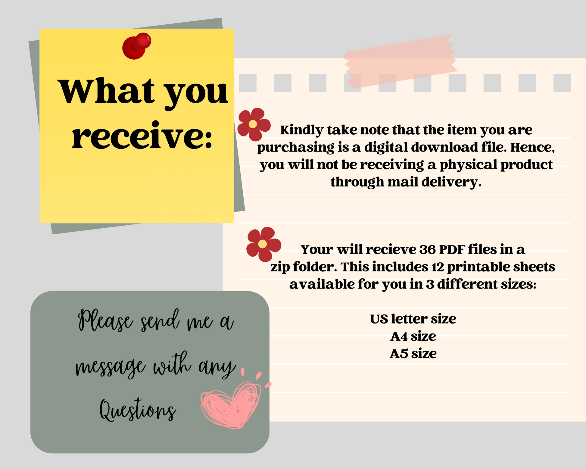 You will receive 3 files that contain 12 PDF pages 📂 in 3 sizes: